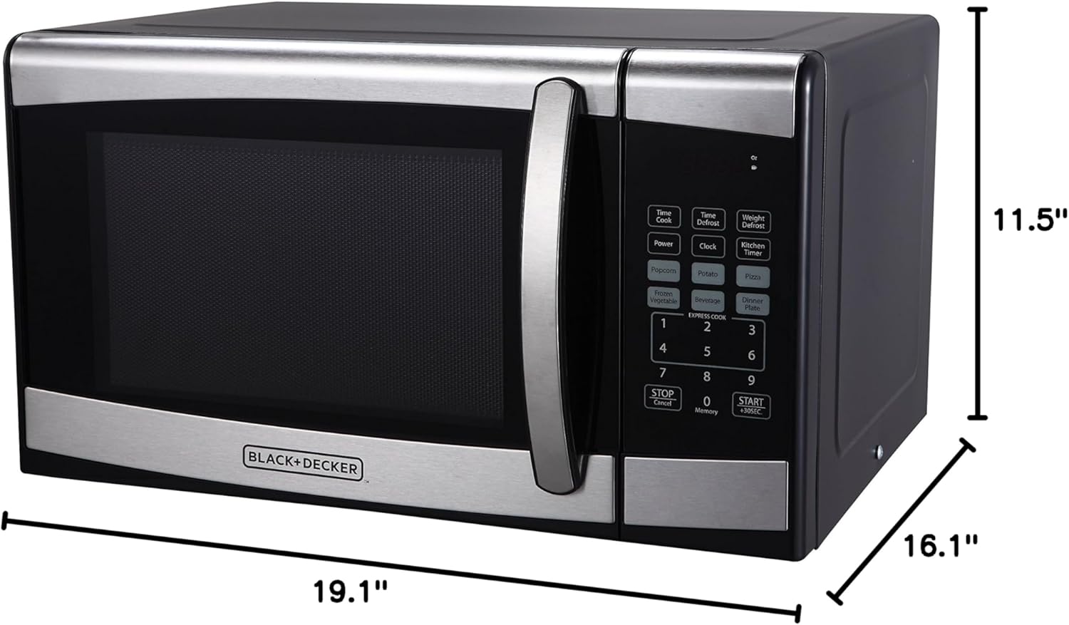 This Black + Decker 0.9 Cubic Foot 900 Watt Stainless Steel Microwave features 11 power levels, removable glass turntable and a spacious interior. Advanced technology provides even heating and defrosting for great results without overcooking. Choose power levels up to 900 watts to cook a variety of foods. The large LED digital display has a clock function and can also display a countdown timer as well as the cooking time remaining. Easily open or close the microwave with the large, easy-to grip door handle. The classic stainless steel exterior is easy to clean and its traditional styling looks good in any kitchen.