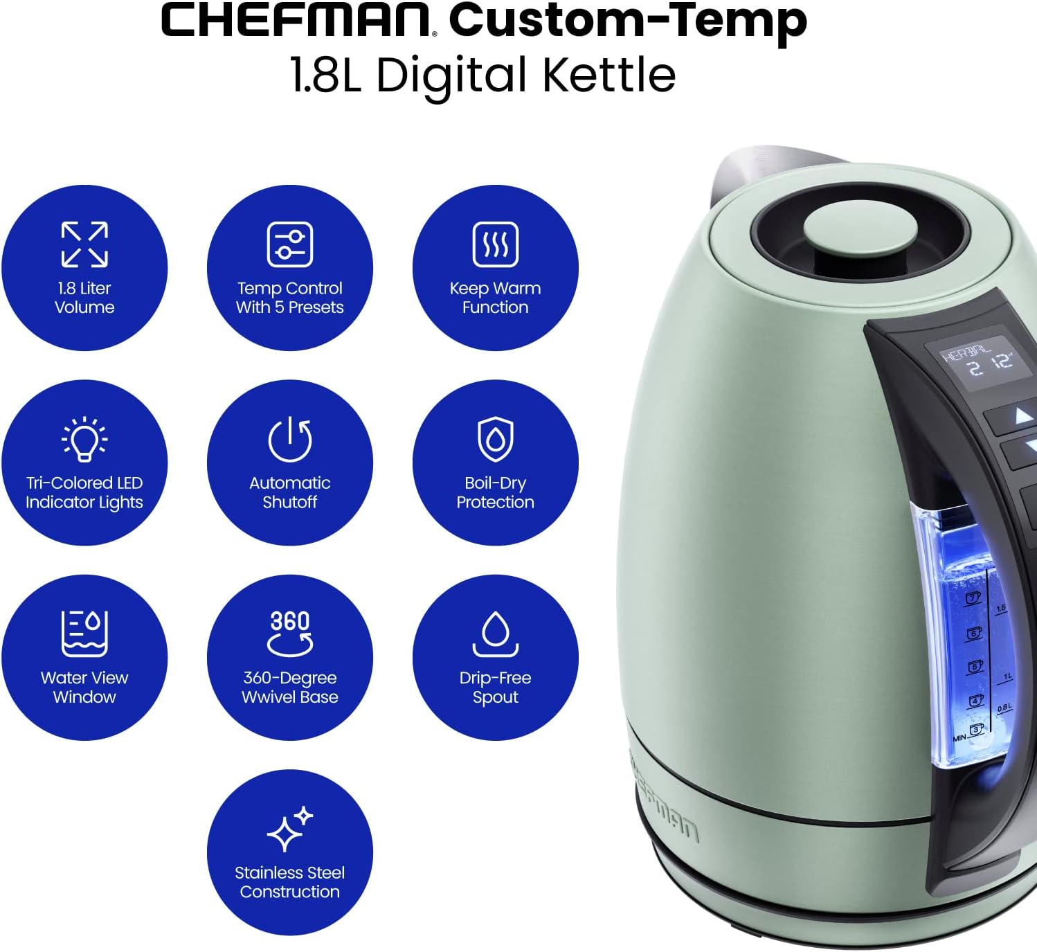 The Chefman® Custom-Temp 1.8L Digital Kettle heats water fast and to precise temperatures for hot beverages, soup, ramen, oatmeal and more! Tri-colored LED lights indicate whether the kettle is in standby, heating, or keep warm mode plus the automatic shutoff and boil-dry protection add extra peace of mind. The water view window lets you know how much water is left without needing to look inside and the cord-free design keeps this hot water maker portable for serving guests in another room. The 360-degree swivel base and drip-free spout make pouring easy and mess-free. Purchase includes a 1-year assurance from Chefman. For information on how to use your product, scroll down for a PDF User Guide.1500 Watts/120 Volts–RJ11-17-SS-TC-RL-GREEN