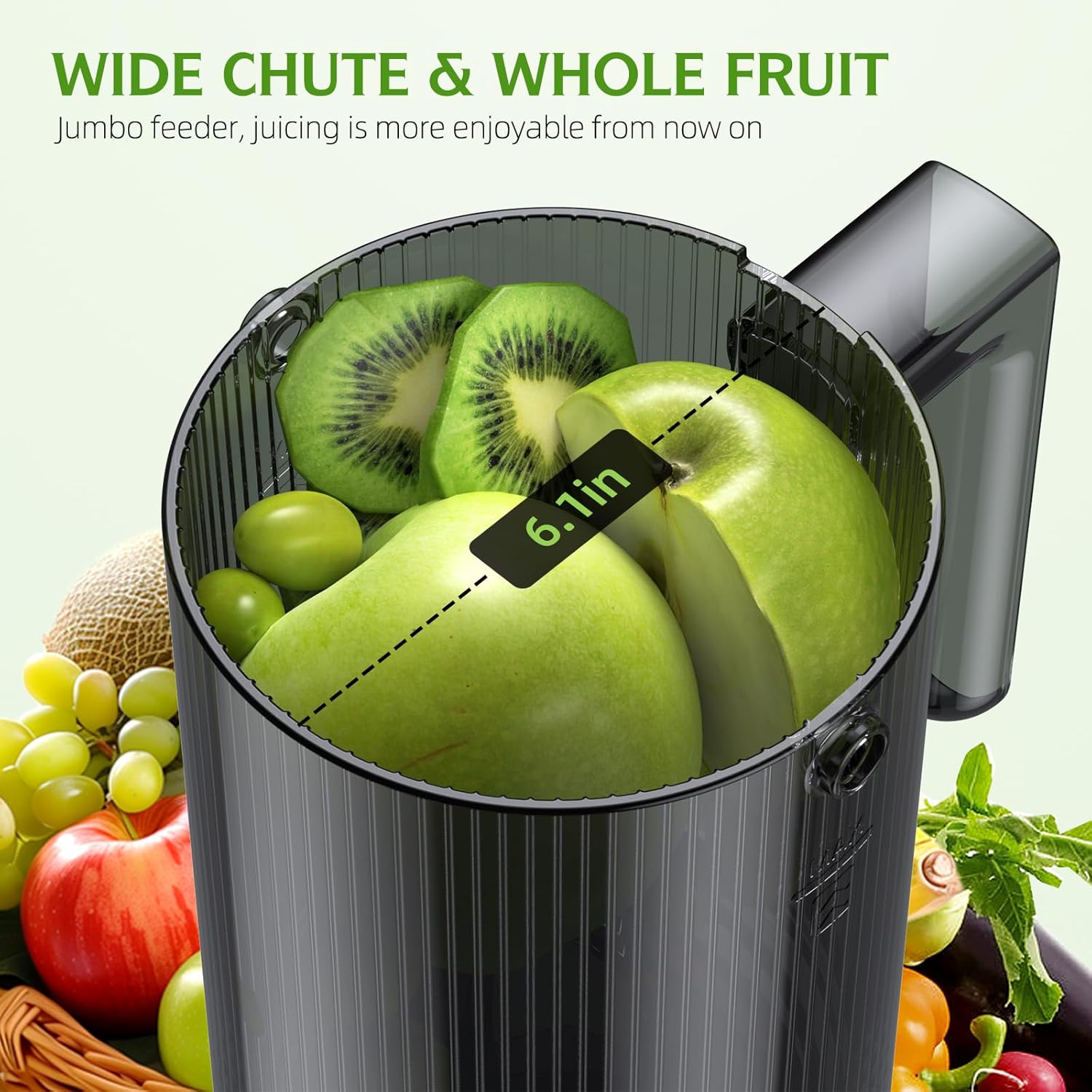【Dual Slot Design, Flexibility to Meet Ingredient Challenges】The cold press juicer machines have a spacious 6.1-inch main feed slot that makes feeding large pieces of fruits and vegetables a breeze, and the compact auxiliary feed slot is specially designed for strips of ingredients to use every inch of the ingredient.