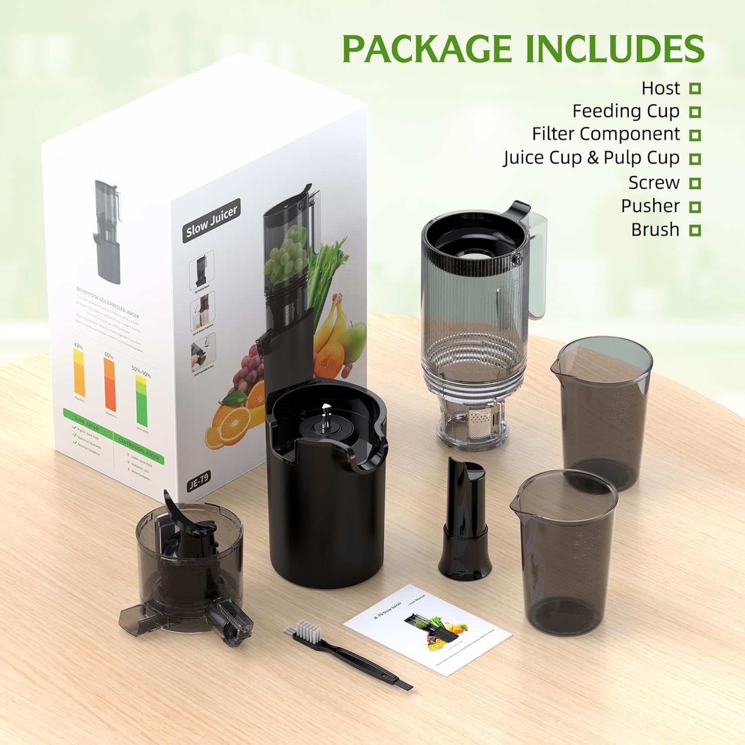 【Convenient Assembly & Cleaning, Save Time & Care】The assembly and disassembly process that is simple and quick can be completed in a few minutes. The unique reverse function effectively prevents ingredients from jamming and further simplifies the cleaning process. With the brush, the residue can be easily removed, and some cold press juicer components even support dishwasher cleaning, making the cleaning work easy and burden-free.