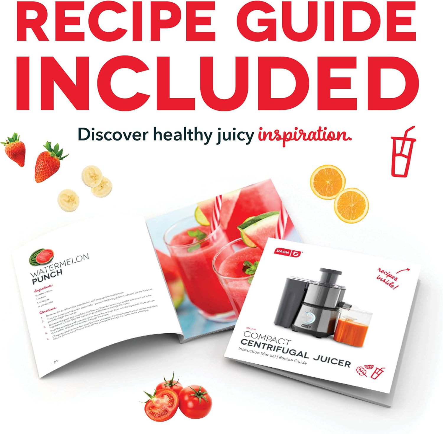 INCLUDES: Dash Compact Centrifugal Juicer, Ingredient Pusher, Juice Container, Pulp Container, and Recipe Guide. Backed by 1-year manufacturer warranty.