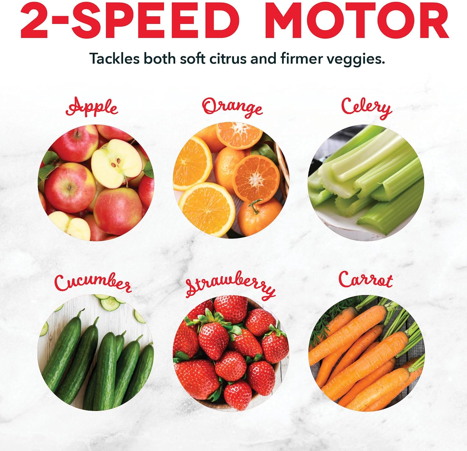 DUAL-SPEED VERSATILITY: Slow speed for juicing soft fruits and veggies like oranges, tomatoes, and others, and fast speed for harder fruits and vegetables like carrots, celery, beets, kale and many others.