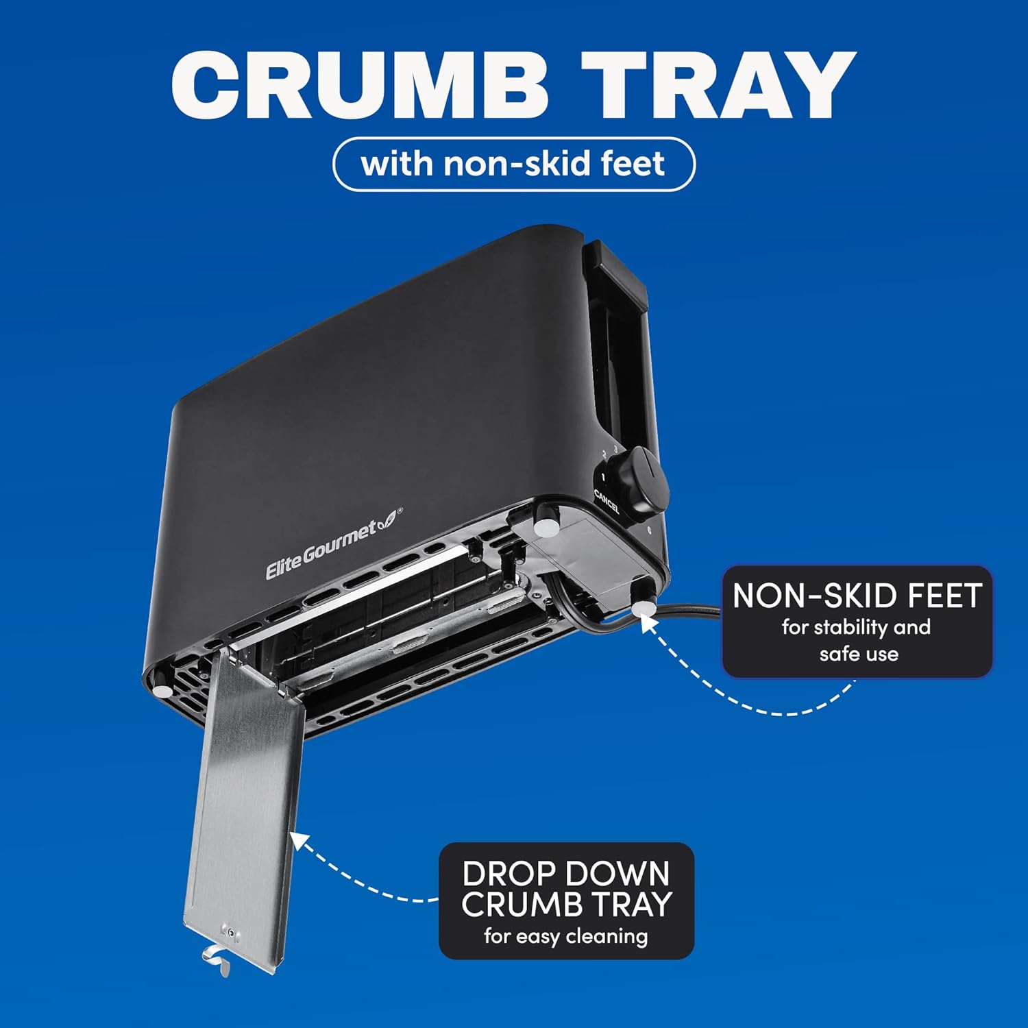 Enjoy perfectly toasted bread, bagels, English muffins and more with the Elite Gourmet Single Slice cool touch toaster. It has 6 variable toasting shades allowing you to toast to your preferred shade every time. It features a toasting lever for easy and safe removal of breads, a handy cancel function to stop the toasting cycle if needed and a cool-touch exterior for safe handling. It also features a convenient drop-down crumb tray for fast and easy cleanup. Plus, a handy Cancel feature to quickly terminate toasting cycle and release the toast. The compact design is great for small kitchens, office, dorm rooms and Recreational vehicles.