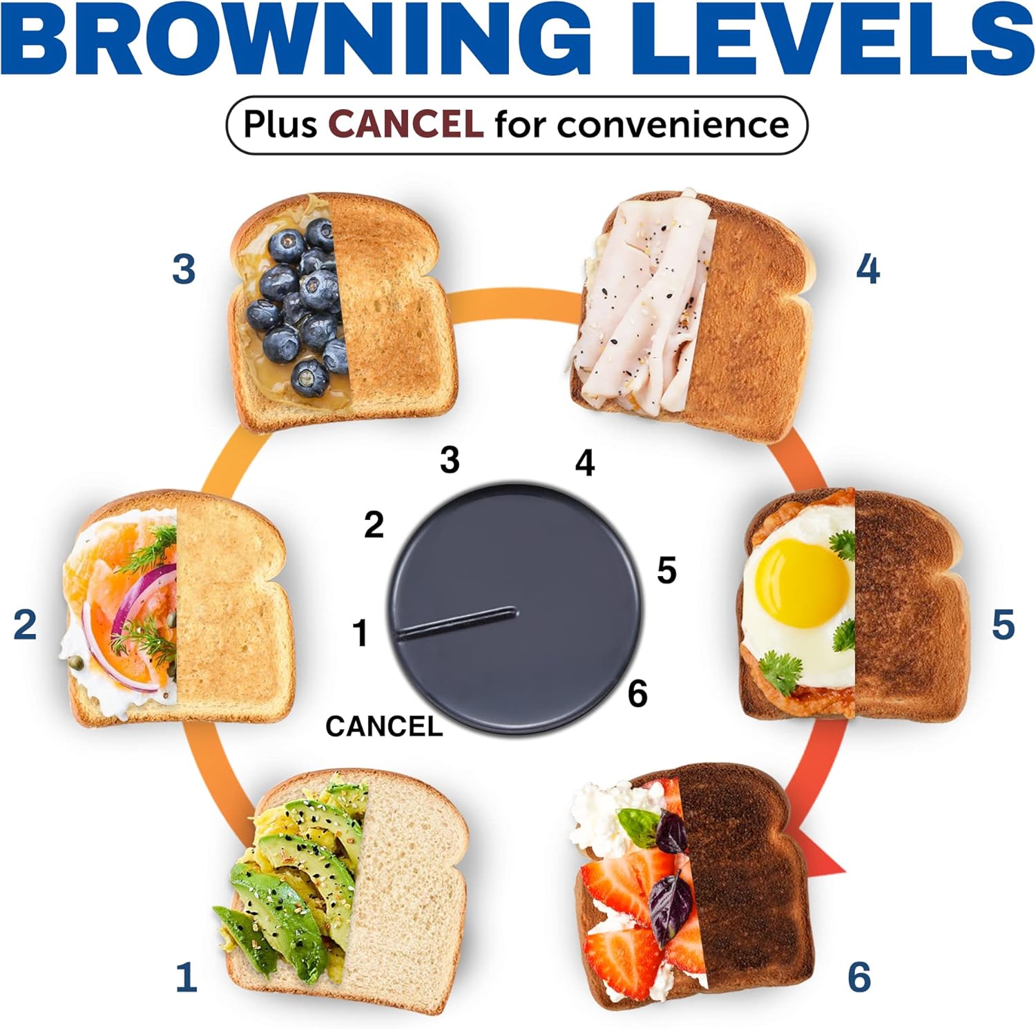 6 ADJUSTABLE TOASTING LEVELS to select the perfect browning shade for your bread. From slightly warm to dark and crunchy.