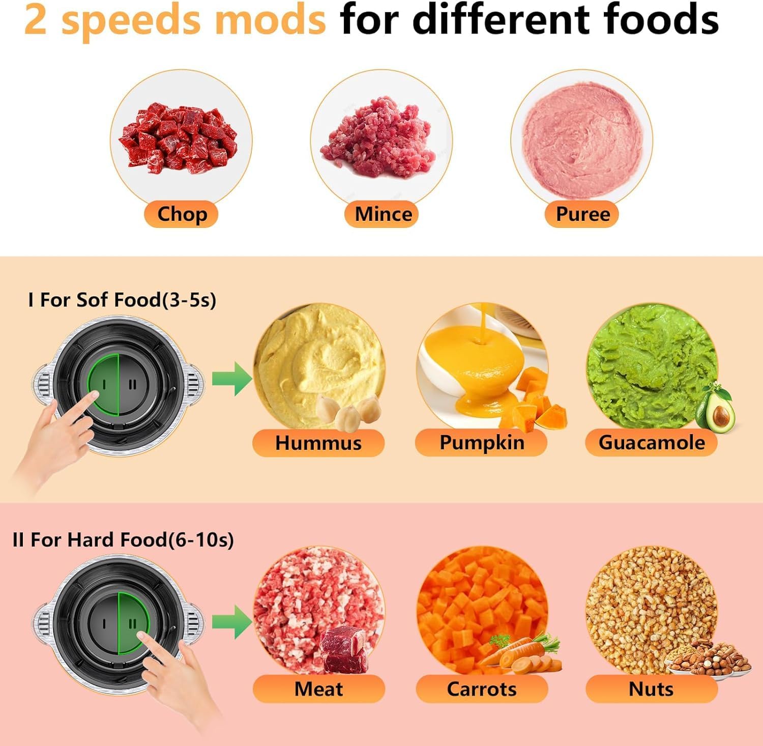 𝟐 𝐒𝐩𝐞𝐞𝐝 𝐂𝐨𝐧𝐭𝐫𝐨𝐥: The meat processors with 2 speed control, “I”low speed, suitable for fruit, garlic, onions and other soft ingredients. “II” high speed, suitable for carrots, nuts, meat, beans and other hard food materials.