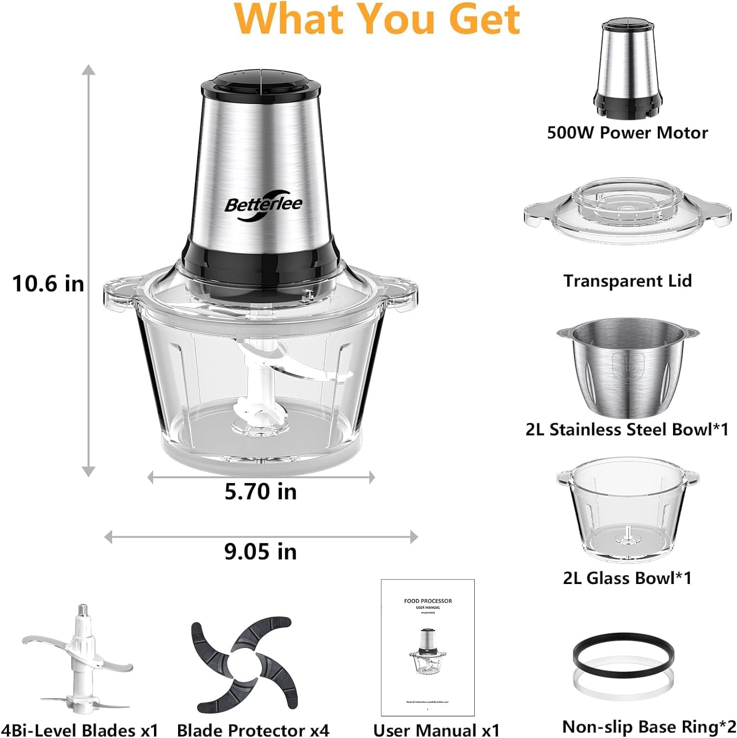 𝐕𝐞𝐫𝐬𝐚𝐭𝐢𝐥𝐞 𝐅𝐨𝐨𝐝 𝐏𝐫𝐨𝐜𝐞𝐬𝐬𝐨𝐫𝐬: The reliable food processor features 2 bowls(8 Cups glass bowl+8 Cups stainless steel bowl) and 1 set of bi-level blades. Betterlee BPA Free food processors can quickly and easily chop ingridients, onions, guacamole, slice salad, sauces, meats, puree etc.
