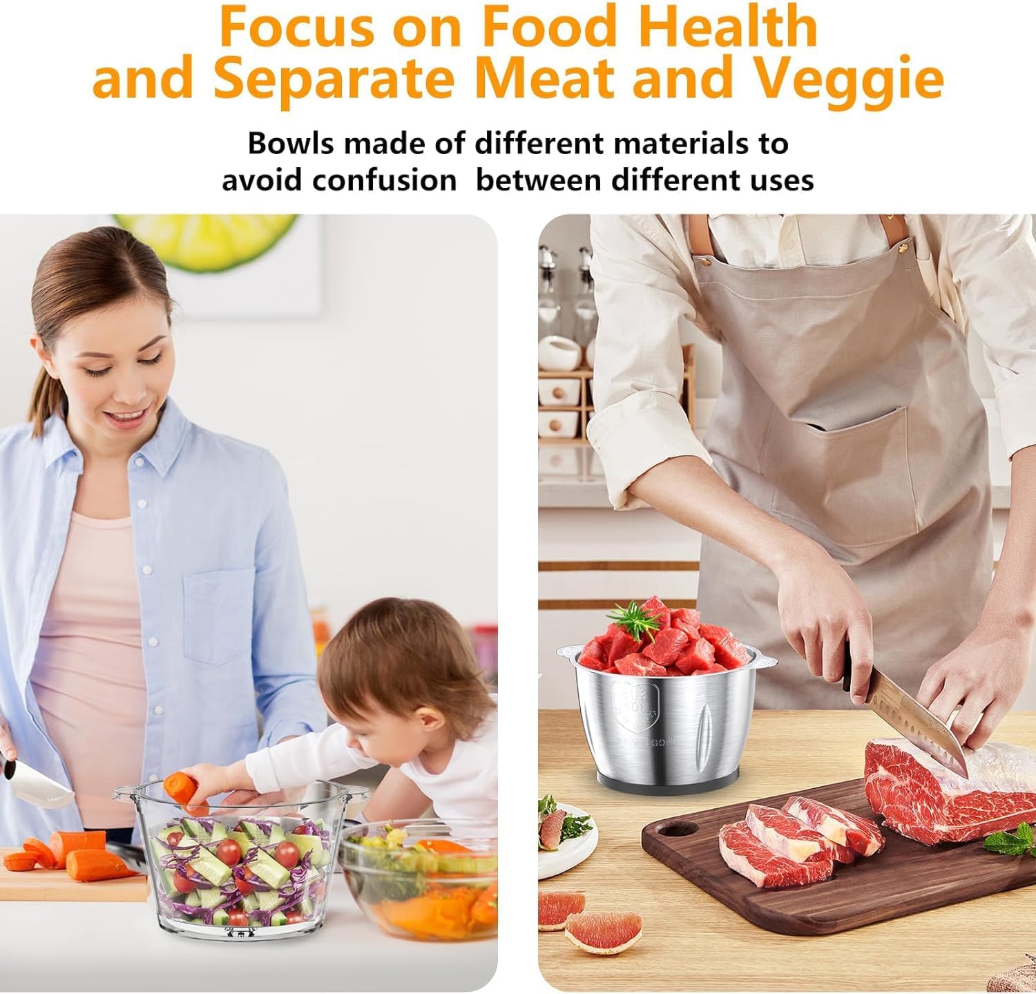 𝐏𝐨𝐰𝐞𝐫𝐟𝐮𝐥 𝐅𝐨𝐨𝐝 𝐏𝐫𝐨𝐜𝐞𝐬𝐬𝐨𝐫𝐬: The Meat Grinder with 500W full copper motor, the service life is 3 times longer than regular motors. With 1 set of Bi-level blades, you can quickly and evenly chop ingredients in 6-8 seconds.