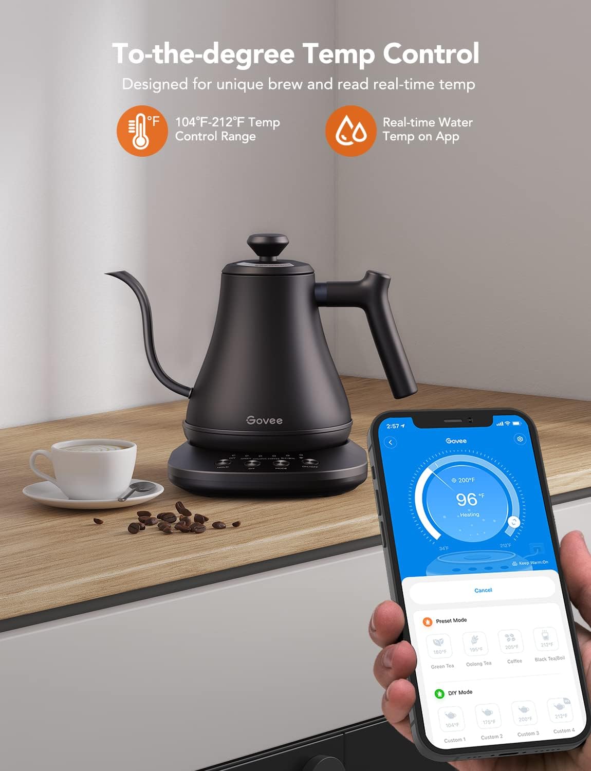 Govee Smart Electric Kettle, WiFi Variable Temperature Gooseneck Pour Over Kettle and Tea Kettle, Alexa Control, 1200W Quick Heating, 100% Stainless Steel, 0.8L, Matte Black