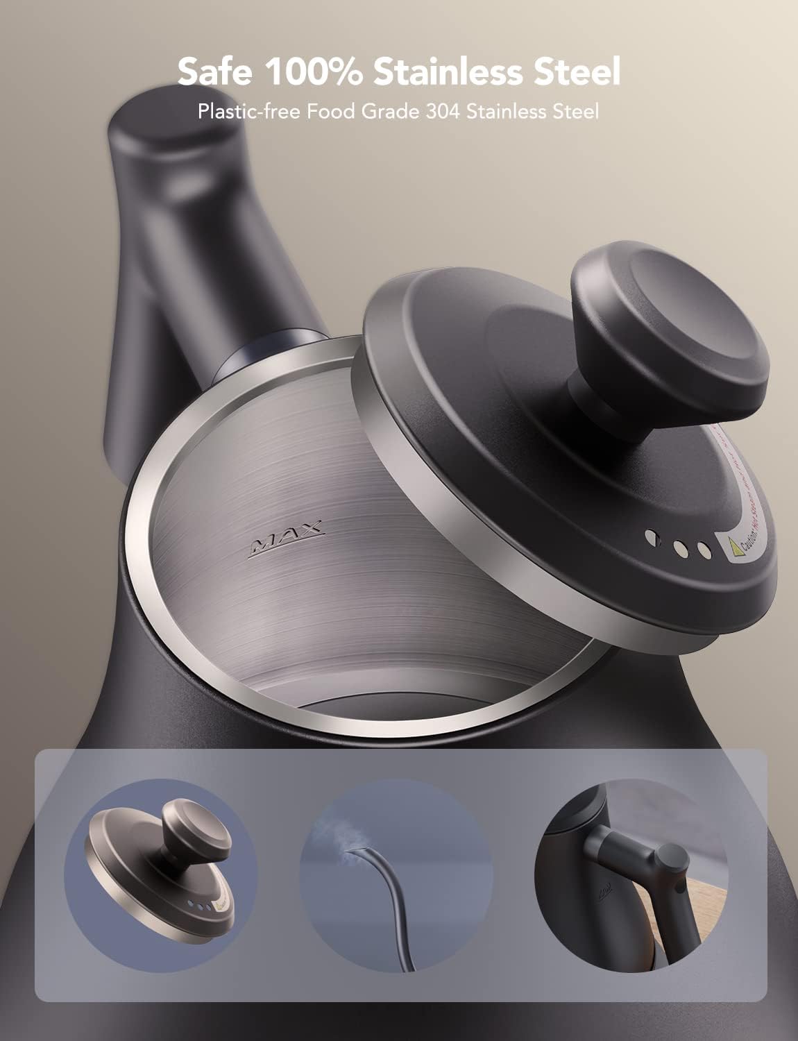 Built for Taste and Safety:Made of 304 food-grade stainless steel, Govee electric tea kettle comes with an NTC temperature sensor that automatically shuts off when the water reaches the desired temperature.The electric kettle with Boil Dry Protection will automatically shut off when the water dries out.