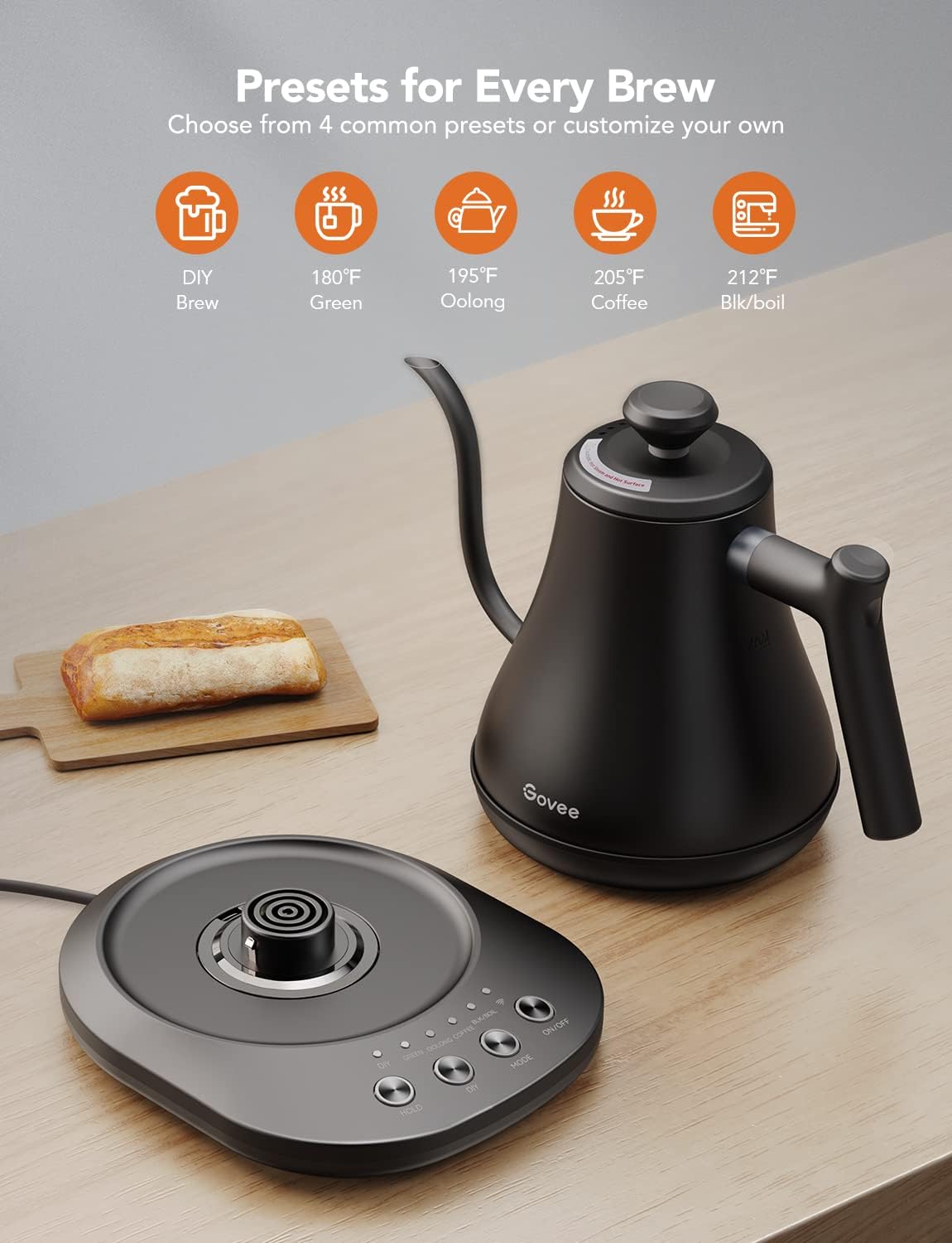 4 Easy Presets & Keep-Warm Control: Govee smart kettle allows you to brew coffee and tea like a pro, with an app that lets you set your precise desired temperature from 104 °F to 212 °F. In addition, the Keep-Warm function automatically maintains water temperature for a full 2 hours. Make Electric Gooseneck Kettle your optimal brewing partner.
