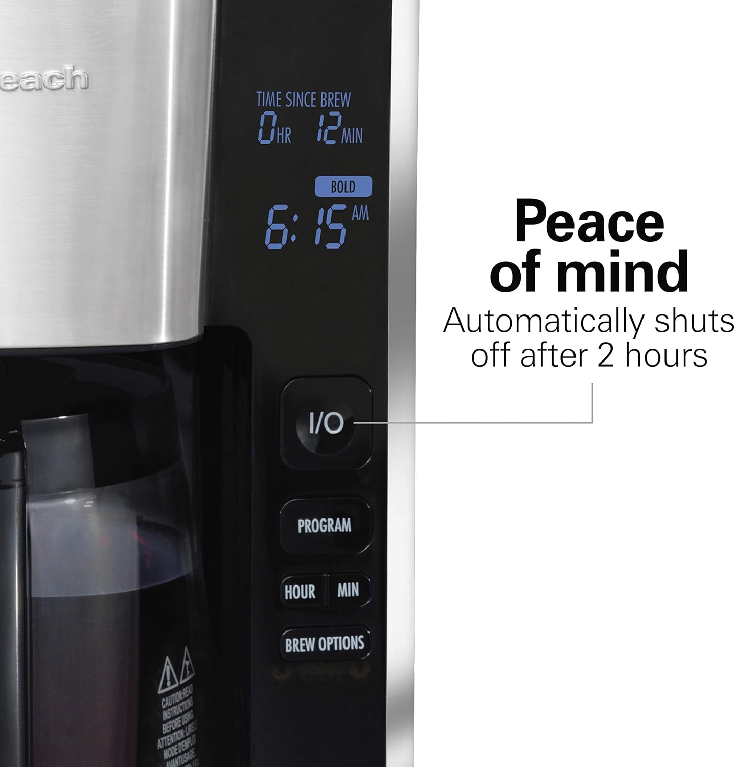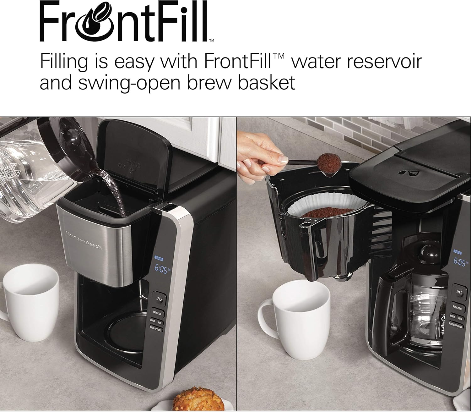 Hamilton Beach 12 Cup Programmable Front-Fill Drip Coffee Maker with Glass Carafe, Auto Shutoff, 3 Brew Options, Black with Stainless & Chrome Accents (46321)