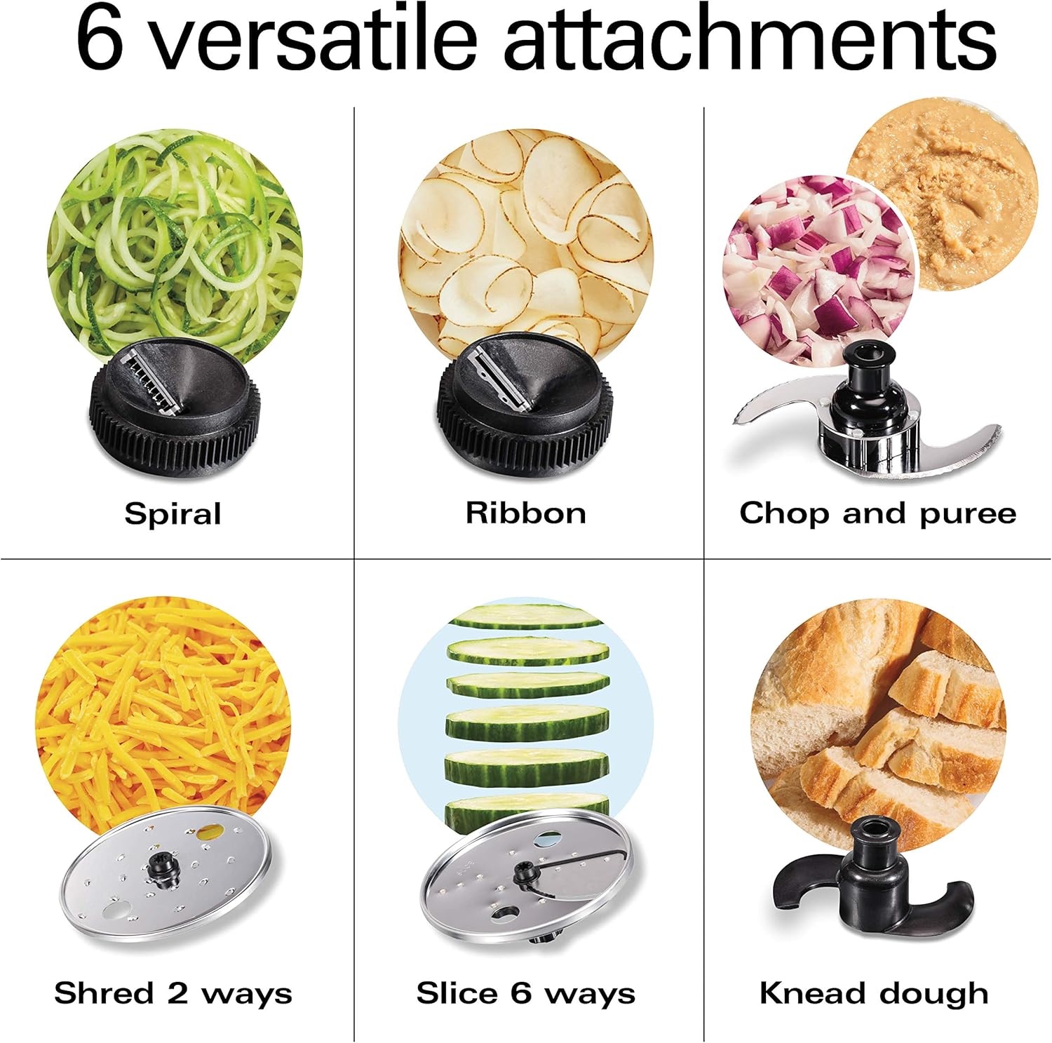 6 VERSATILE ATTACHMENTS: This food processor is also a veggie spiralizer. It includes spiral and ribbon blades, adjustable slicing blade with 6 settings, reversible shredding blade, S-blade for chopping and pureeing, and dough blade.