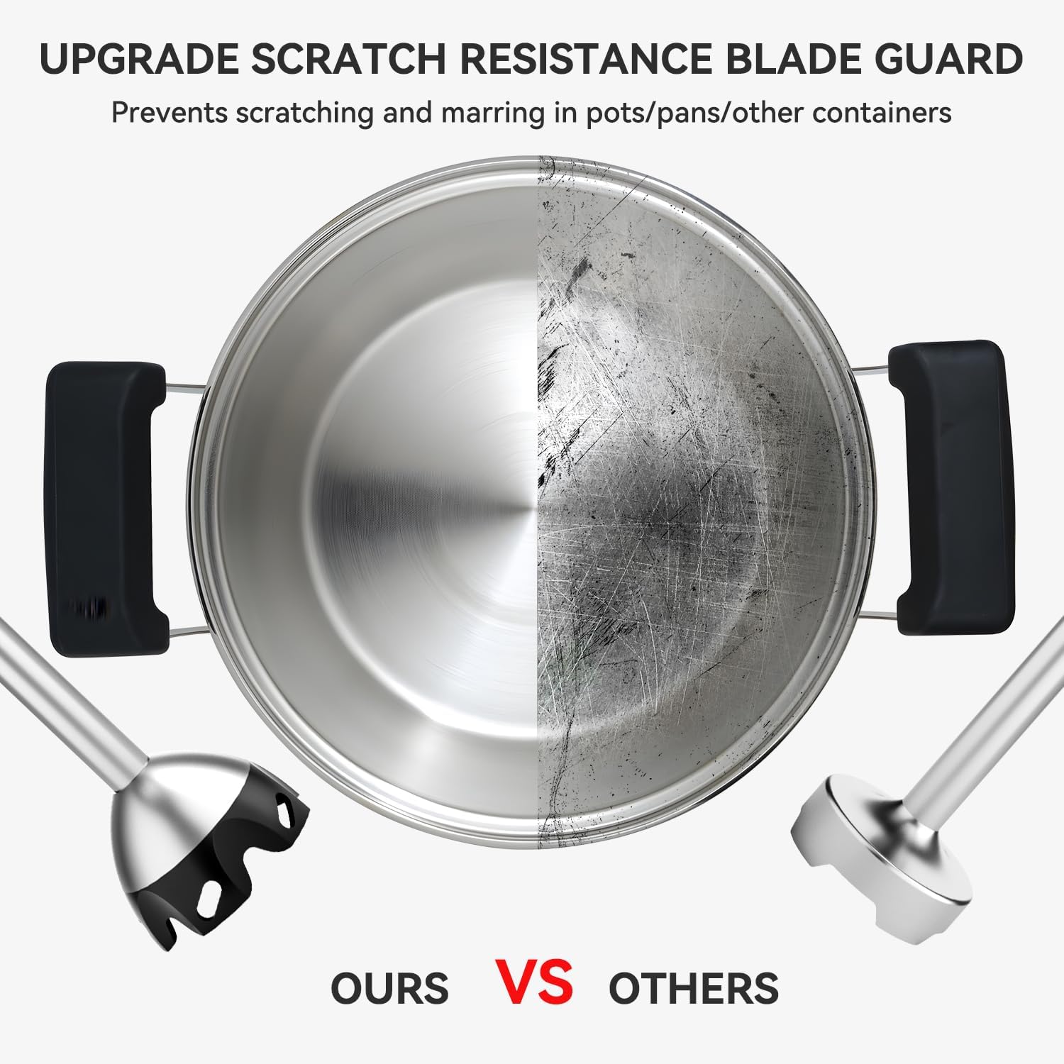 THOUGHTFUL SCRATCH RESISTANT FEATURE & SAFE: The upgraded hand blender scratch-resistant blade guard design specifically protects non-stick cookware, allowing you to choose any of your pots or pans and no more worry about scratching them. The hand mixer electric handheld combo is made of BPA-free plastic and 304 stainless steel which is safe, healthy and long lasting.