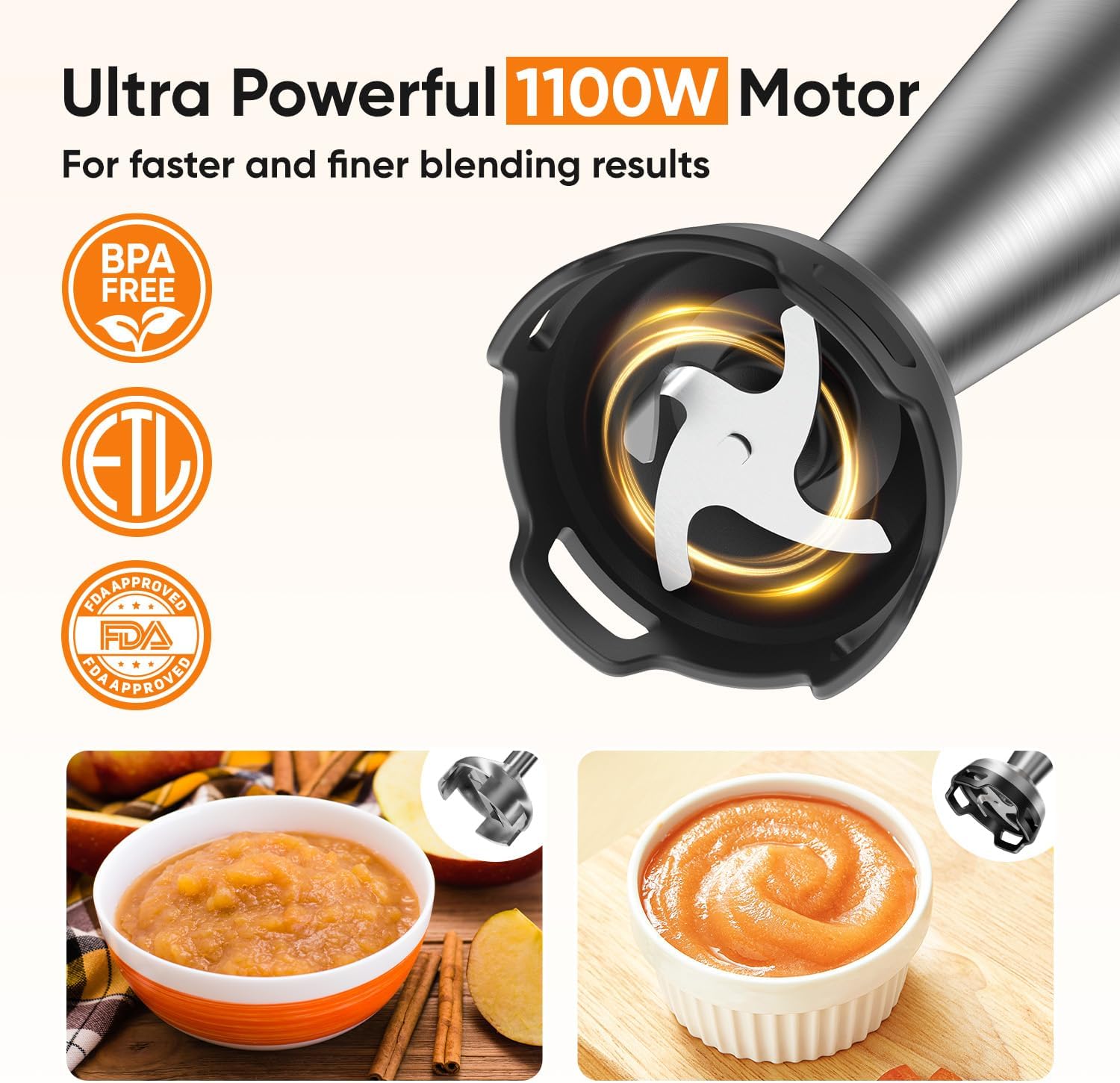 1100W Powerful Blending for Smooth Results: Equipped with a robust full copper motor, this immersion blender delivers efficient, even blending to mix, whisk, or froth ingredients to perfection. Ideal for creating creamy smoothies, pureed soups, sauces, marinades, and more—making kitchen prep quick and easy