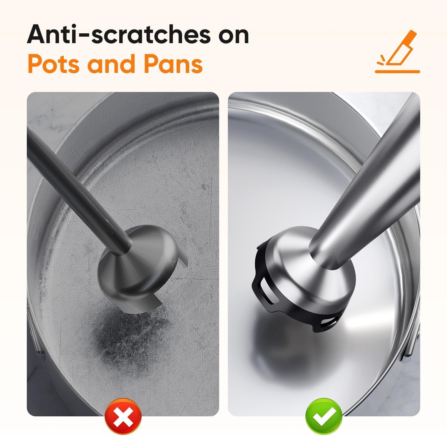 No More Scratch and Splash:This handheld immersion blender features a bell-shaped base and a food-grade nylon blade guard to reduce suction, protecting your pots and pans from scratches. It also minimizes splatter, keeping your kitchen and clothes mess-free