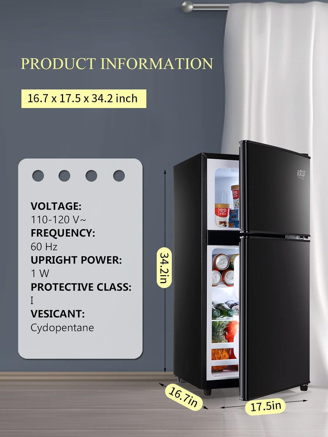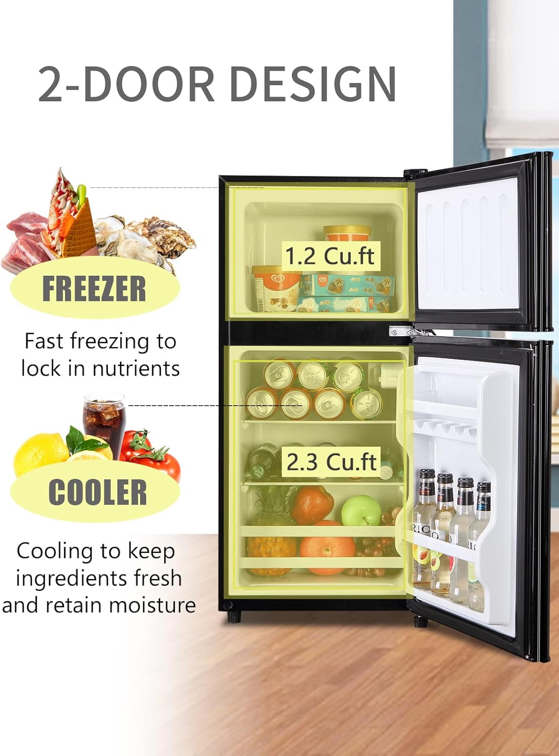 🎀 Two Door Design: This refrigerator has large capacity of 3.5 cu.ft with dual door design. The fridge has large 2.3 cu.ft fresh food capacity for keeping foods organized and 1.2 cu.ft freezer capacity for storing frozen foods. You can access the mini freezer or refrigeration compartment with two exterior doors.