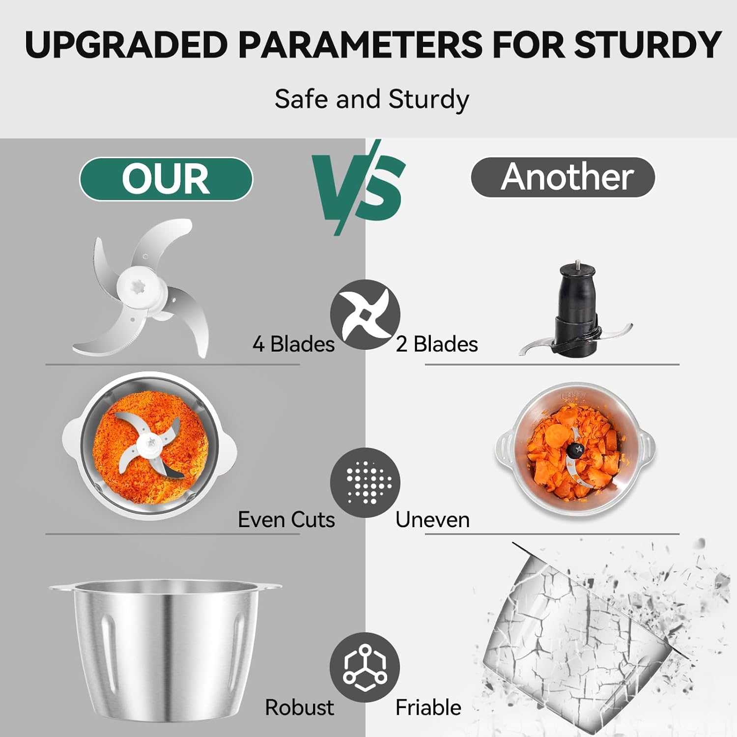 Safe and Efficient: Our food processor equipped overheating protect, it will automatically stop working at high temperature, the blade will not spin when the machine is not lock correctly. 4D sharp blades design allows the blades to evenly chop food in 5-20s, more safety and fast