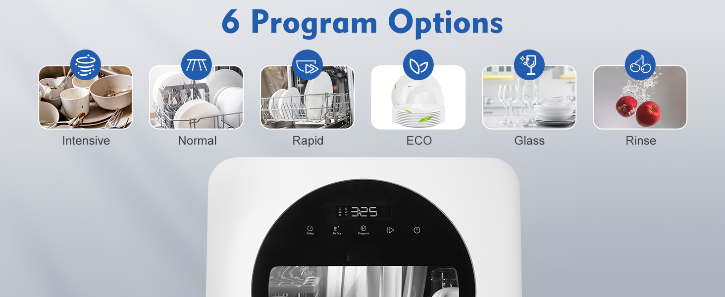 【SIX WASHING PROGRAMS】This counter top dishwasher with water tank perfectly provides washing programs: intensive washing, normal washing, rapid washing, ECO washing, glass washing, fruit washing. Various cleaning methods to meet your different needs. The highest temperature of this countertop dishwasher no hookup can reach is 167 ℉, and high-temperature cleaning is more suitable for baby care. After each wash cycle finishes, an extra Dry mode provides an extra 4.5hours of drying, and offers 72-hour ventilated storage to prevent odors and keep your dishes clean.