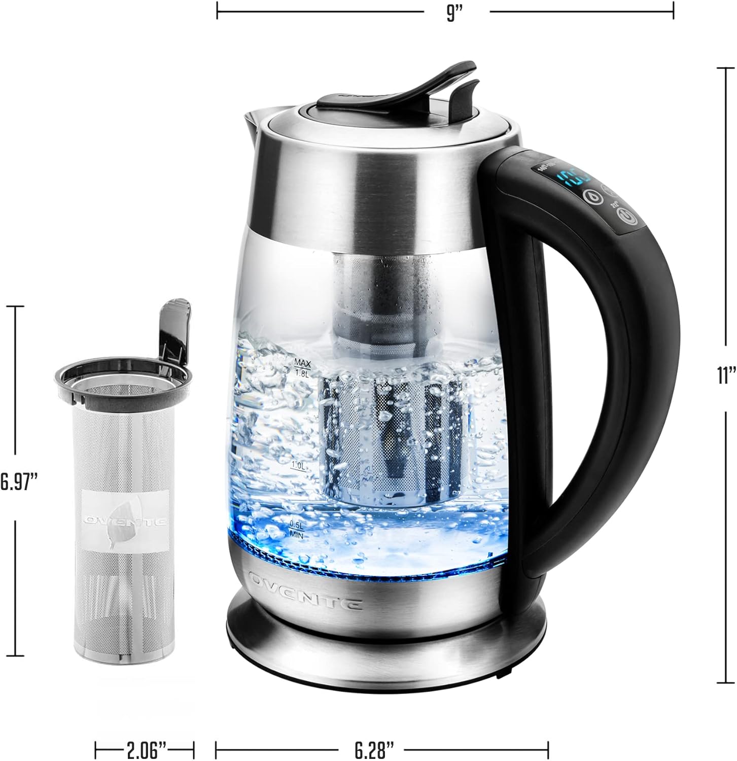 OVENTE Electric Glass Kettle Water Boiler 1.8 Liter BPA Free – 1500W w/Stainless Steel Infuser, Set Temperature Control, Auto Shut Off, Portable Fast Instant Heater for Coffee & Tea – KG661S
