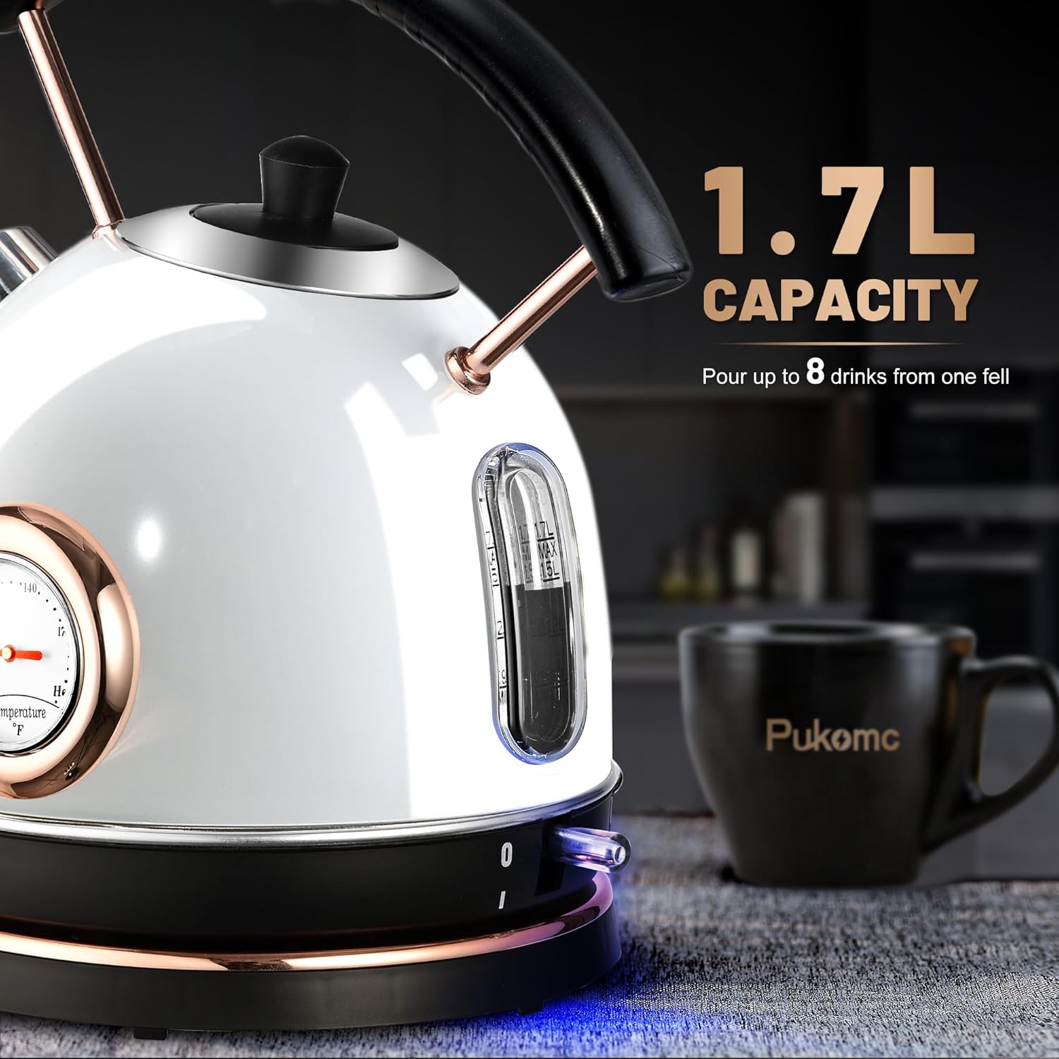 Pukomc Retro Electric Kettle Stainless Steel 1.7L Tea Kettle, Hot Water Boiler with Temperature Gauge, Led Light, Fast Boiling, Auto Shut-Off&Boil-Dry Protection (White)