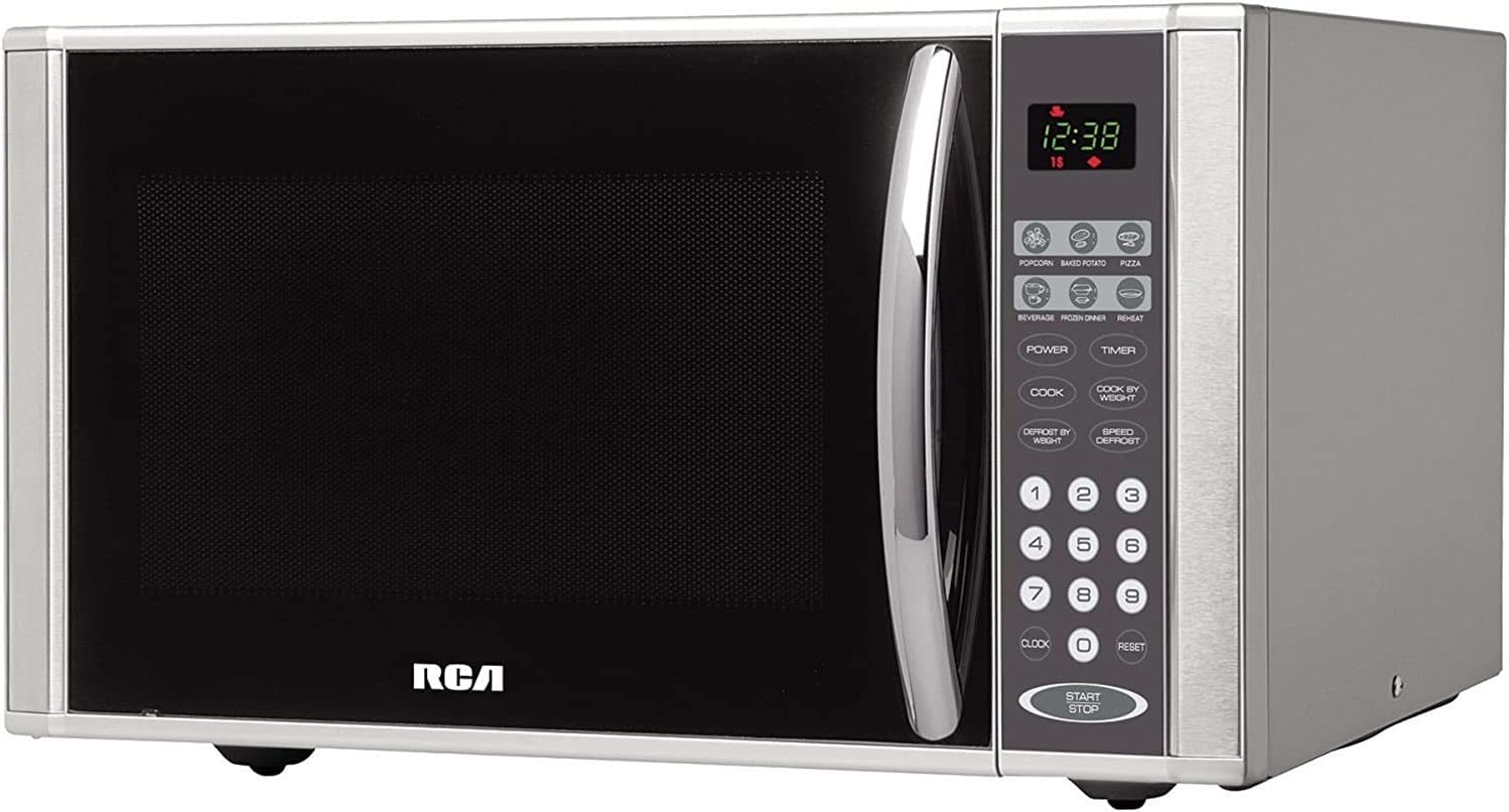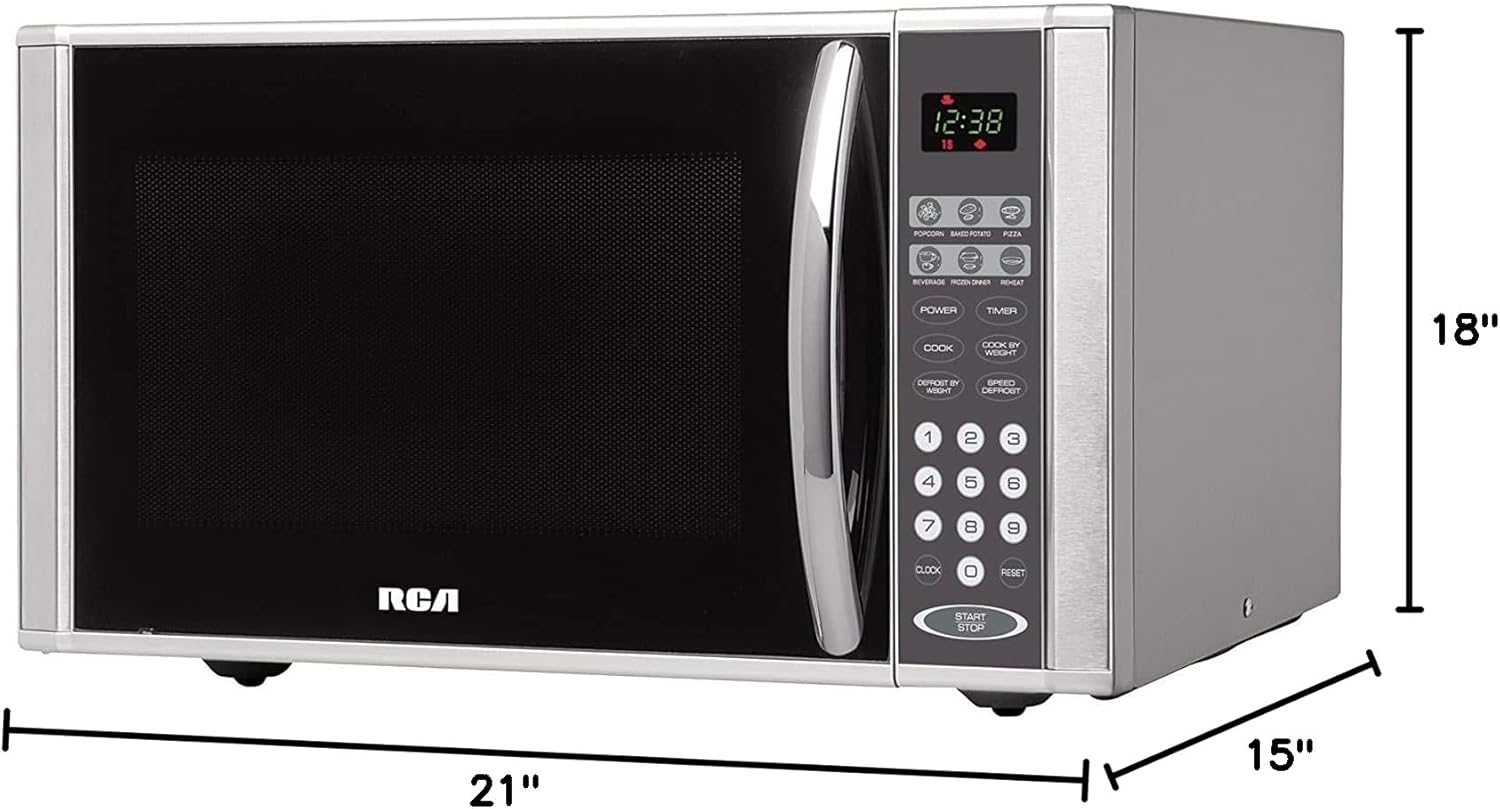 21″ 1.1 cu.ft. Countertop Microwave by RCA Products. With a 1.1-cubic-foot capacity, this stainless steel rca microwave oven allows for quick and convenient meal preparation. The unit’s one-touch auto-cook menu takes the guesswork out of cooking popularly microwaved foods including popcorn, baked potatoes, pizza, beverages, and frozen dinners, while its reheat button makes it easy to warm food items back up again. The microwave’s soft-touch electronic control panel also comes with cook-by-weight and defrost-by-weight options, speed defrost that alternates between defrost and stand times for efficient results, a start/stop button, and a reset button to clear all previous settings. With a sleek stainless steel finish, this microwave will look perfect in any kitchen, office or dorm.