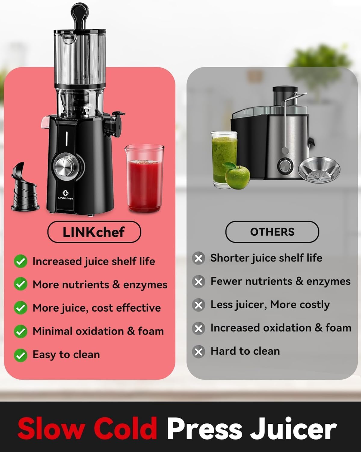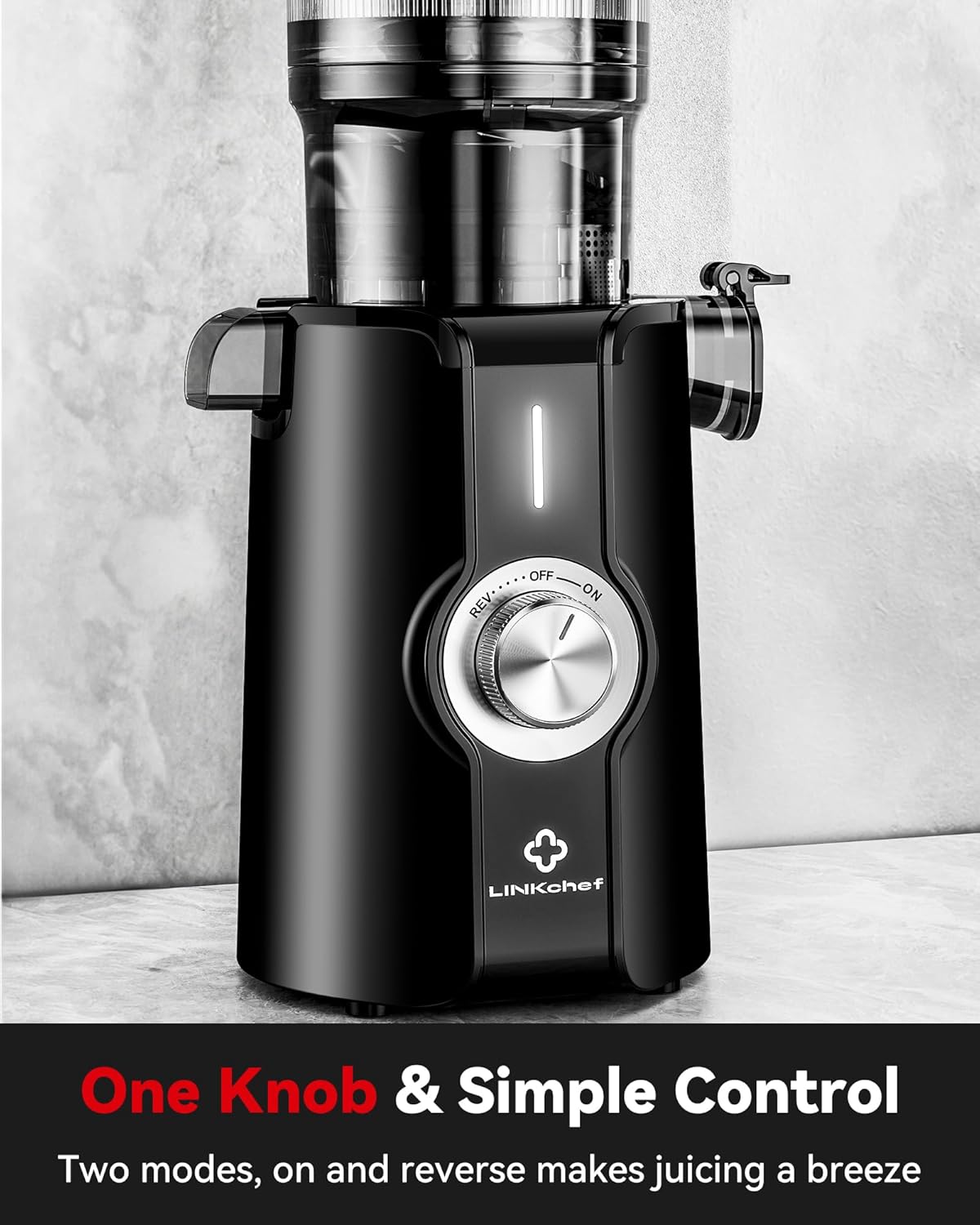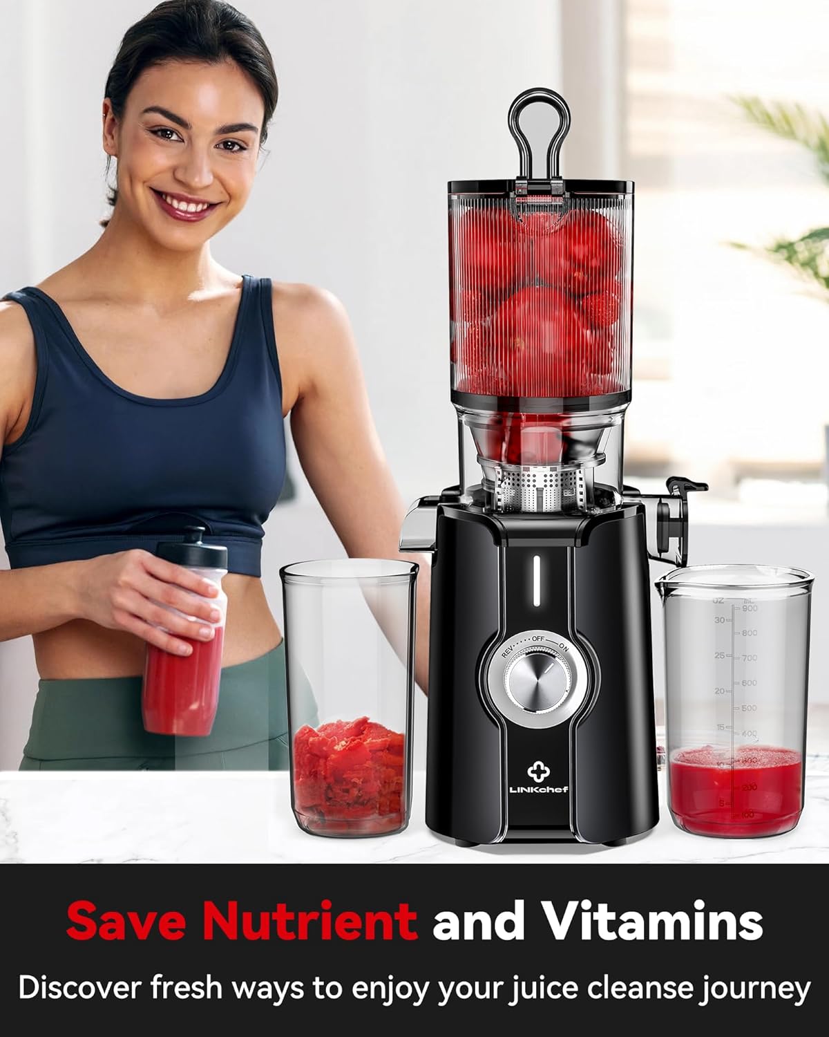 Rush Clear Slow Masticating Juicer Machines, Cold Press Juicer with No-Prep 4.35″ Feed Chute Fit Whole Fruits & Vegetables Juicer Machine Easy to Clean, LINKChef 42oz Capacity, 200w, Blackout