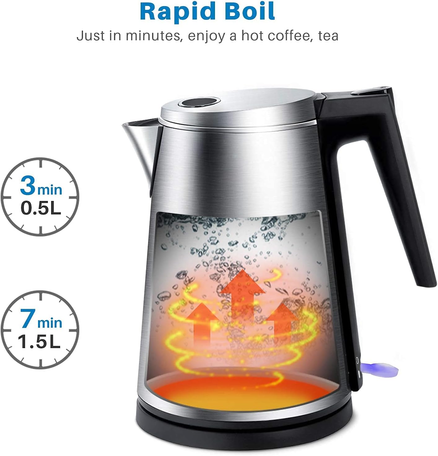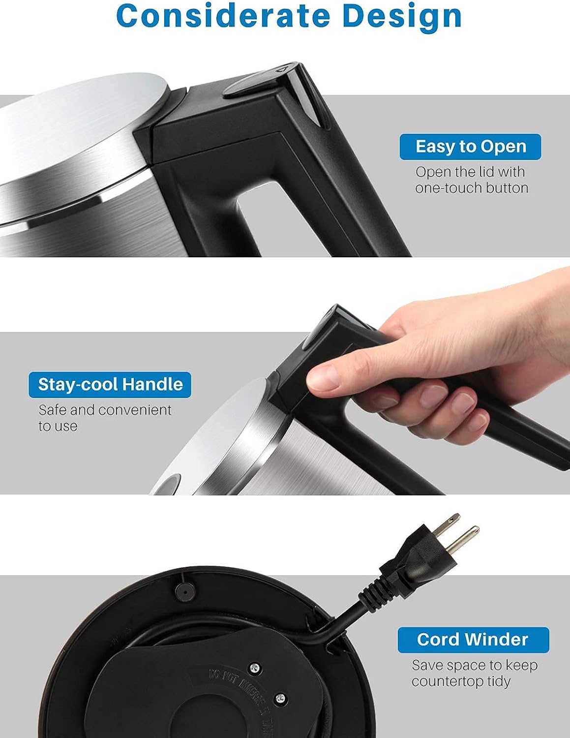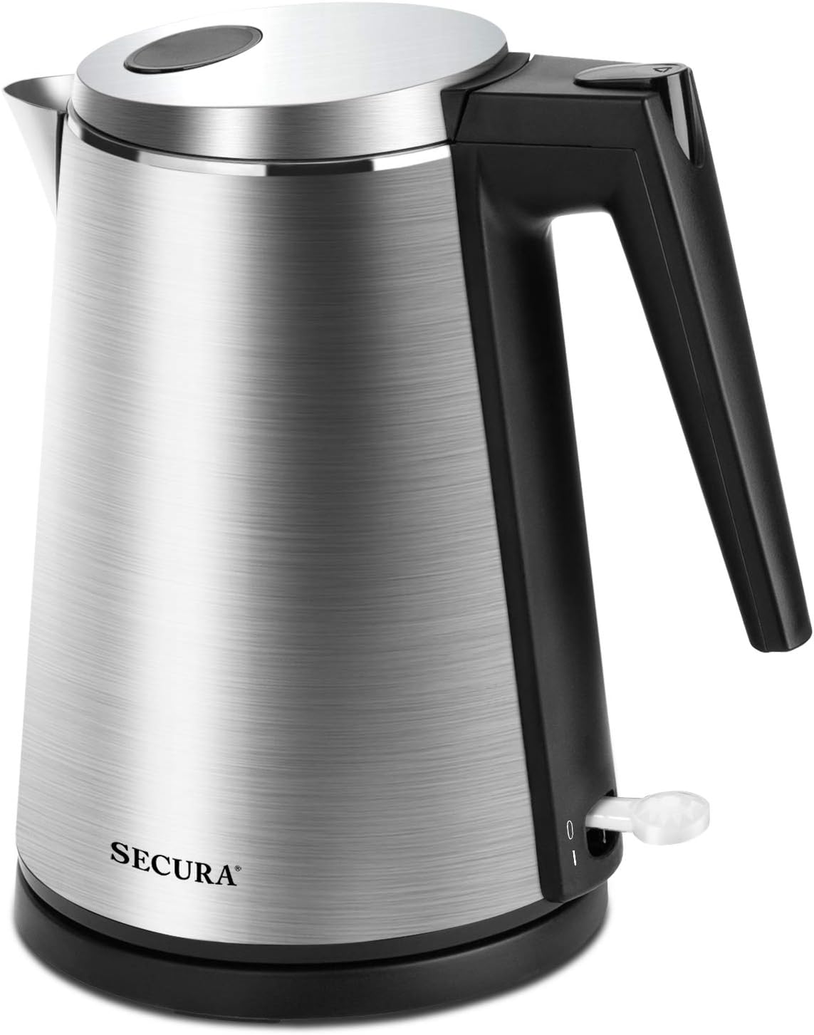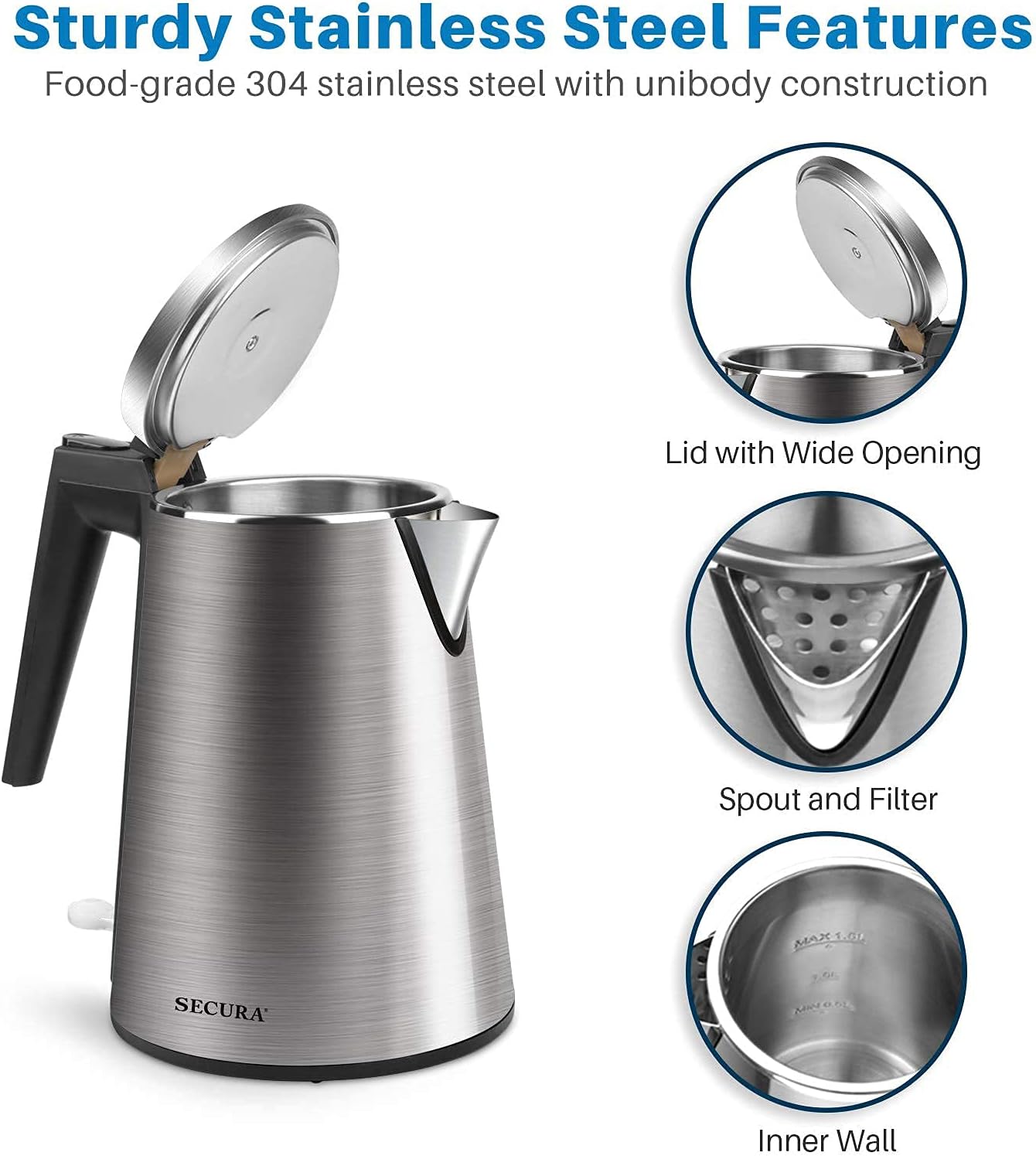Secura Electric Kettle Water Boiler for Tea Coffee Stainless Steel 1.5L Large Cordless Hot Water Pot BPA Free with Auto Shut-Off Boil-Dry Protection LED Light 120V/1350W (K15-F1E)