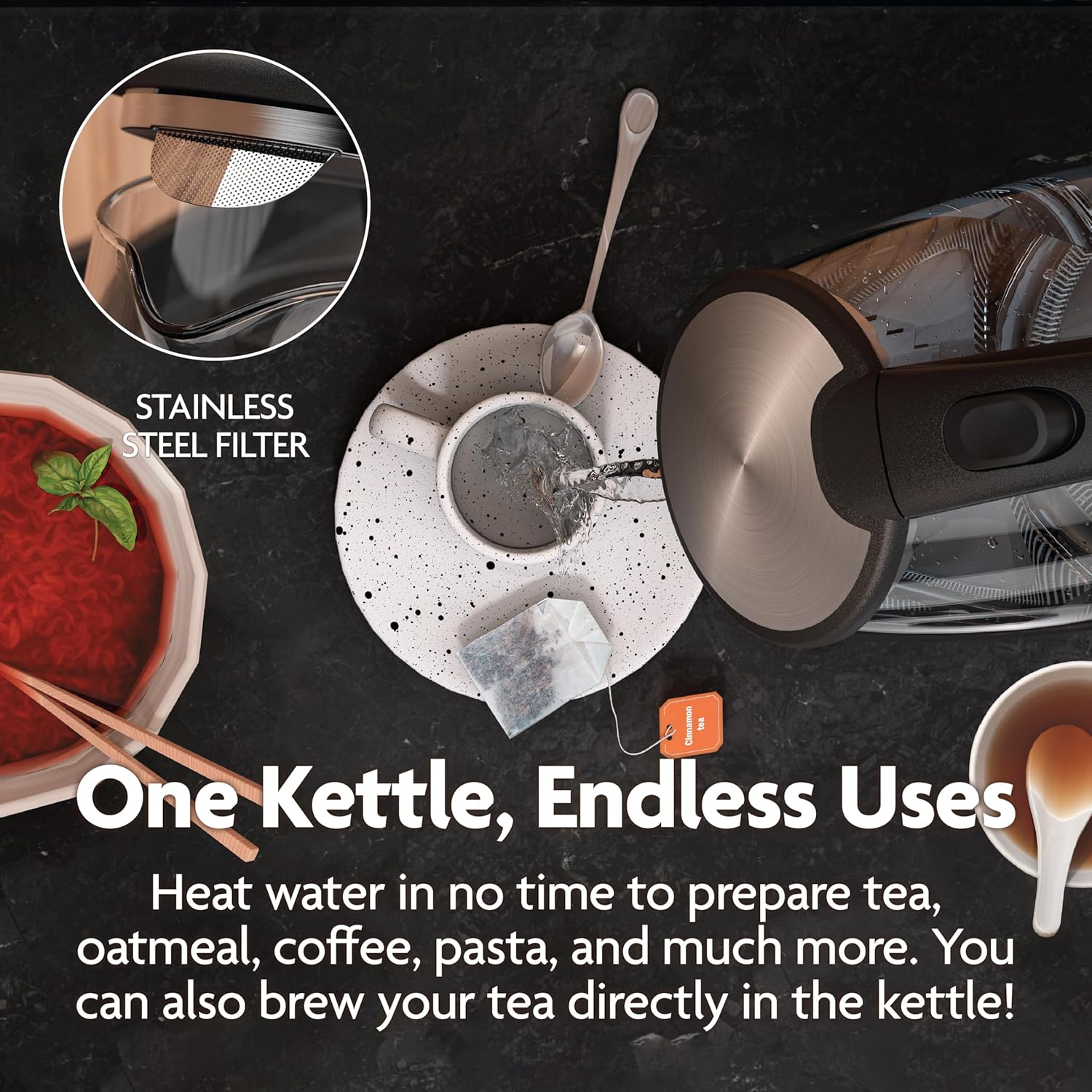 Boil 20% faster than a normal need. Our 1500W duty boils much faster than most lower wattage electrical duties. Ideal for quickly boiling water to make coffee, tea, oatmeal, pasta and much more. Much faster than your microwave, stovetop temp, etc.