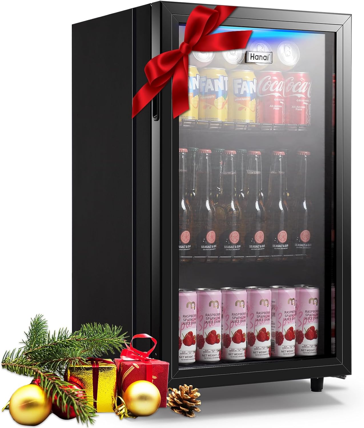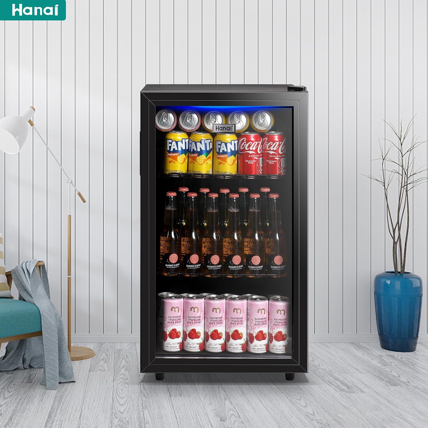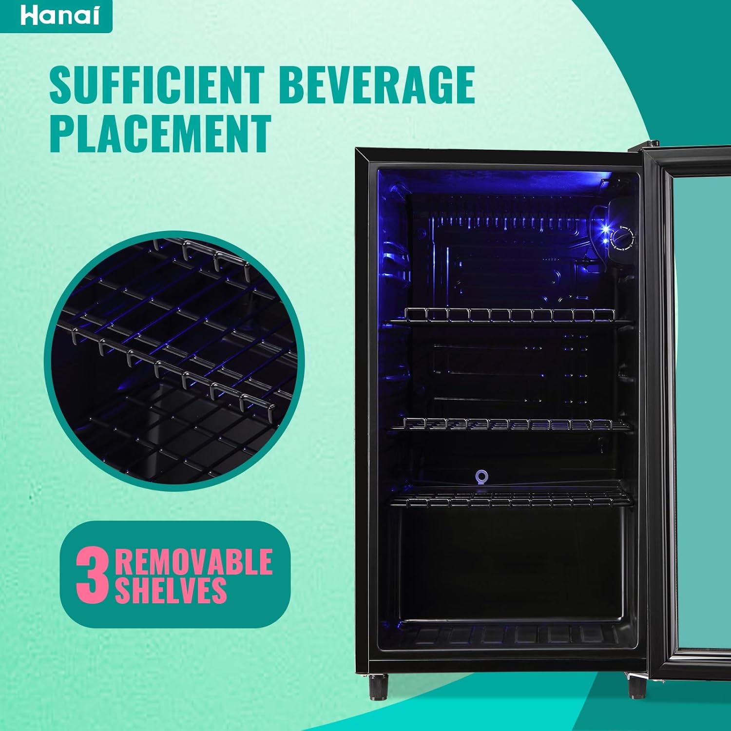 SIMPLE AND FRIENDLY DESIGN: 310 ° open double layer glass door can keep fridge drinks cold; three adjustable shelves can keep food and beverage organized; blue LED light adds atmosphere while keeping drink selection effortless